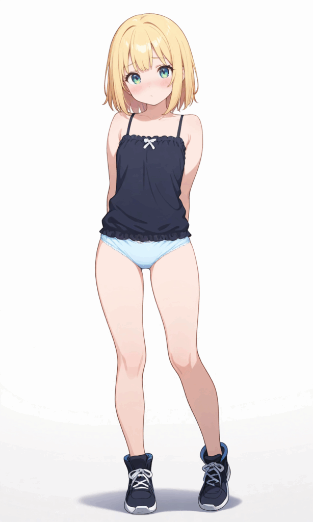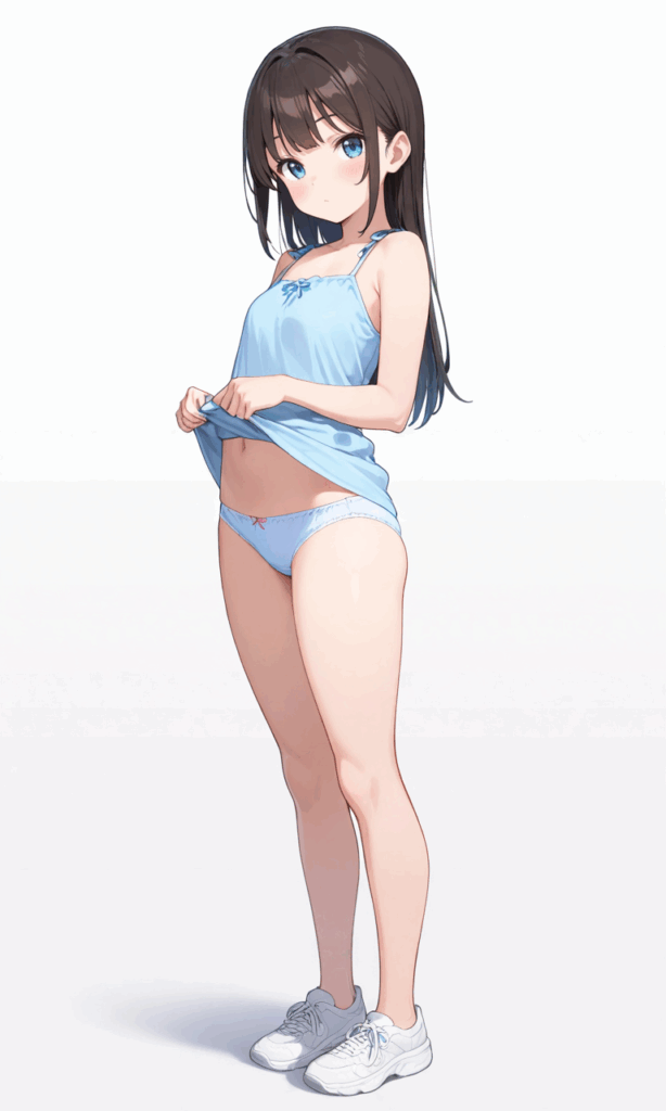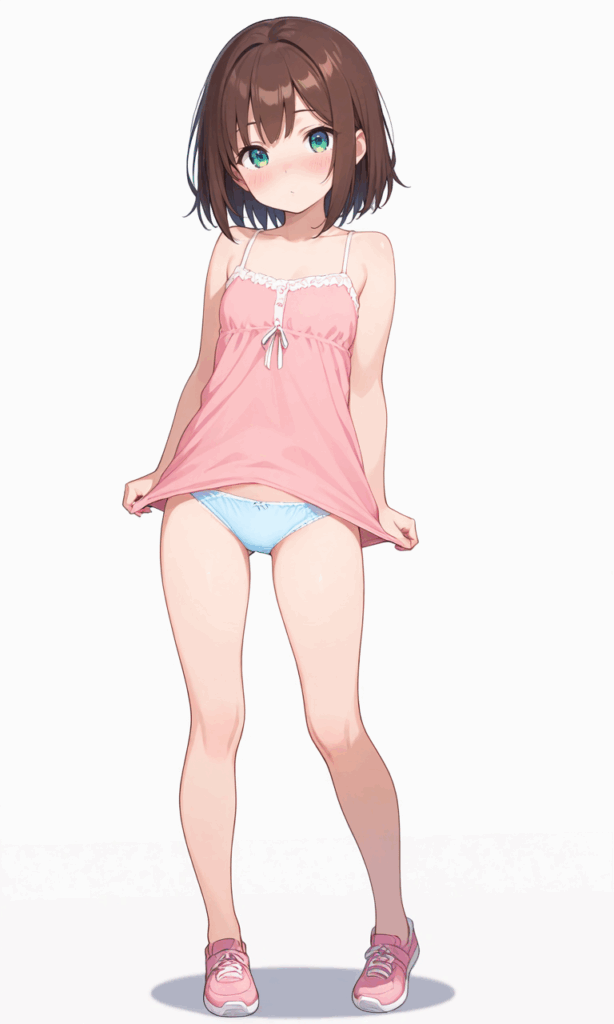 1girl, solo, nude, flat chest, wearing panties, standing erect and immobile, full body, white background,